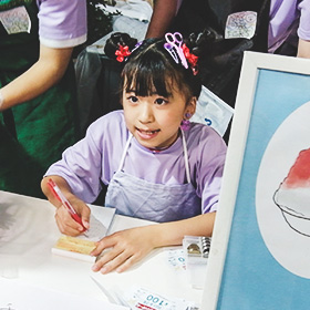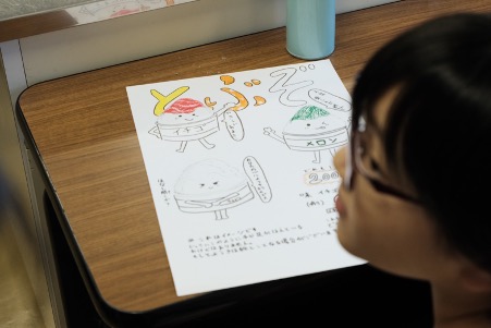 次に、イノベーションについては、創意工夫を引き出そうと、お店の商品のポスター作りを取り入れています。子供たちは自由な発想でポスターを作るため、時にお客様にとっては見づらくよくわからない絵になることもあるのですが、従来のポスターの枠にとらわれない斬新な発想を見ることもありました。例えば自分で考えたアニメのキャラクターを描いてみるとか、全部の商品を並べるのではなく試食して一番おいしかった商品を大きく描いてみるなど、その創造力の豊かさには感心させられました。また出店活動においては、他のお店の探検にいくことで、新たな発見を見出し、そこから何ができるかを考えさせる機会を作っています。声かけにおいてはポスターづくりとともに商品のキャッチコピーづくりを行いますが、ここにも子供独自の視点での発想を見ることがありました。「もちもち」「カリカリ」など、擬態語をうまく活用することなどは、子供らしい発想だと感じました。